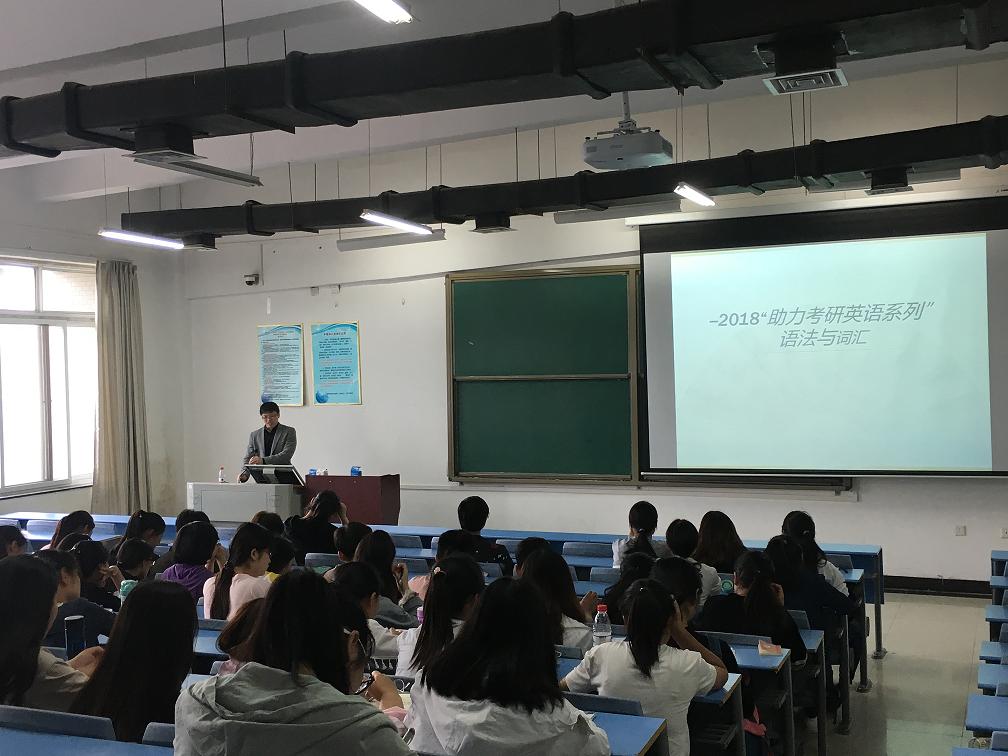 太阳成集团122ccvip助力考研英语讲座第二讲“考研英语基础知识篇”于4月24日晚上、4月26日下午分别在英才校区和龙子湖校区举行,主讲人为旅游英语教研室教师秦礼峰。