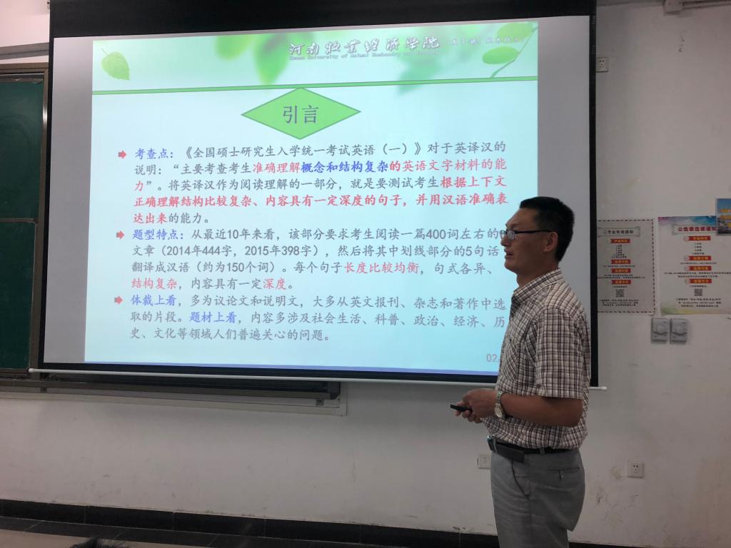太阳成集团122ccvip助力考研英语系列讲座的第五讲----《考研英语翻译技巧》于近日分别在龙子湖校区和英才校区进行。主讲人为太阳成集团122ccvip大学英语教研一室主任吴国权老师。
