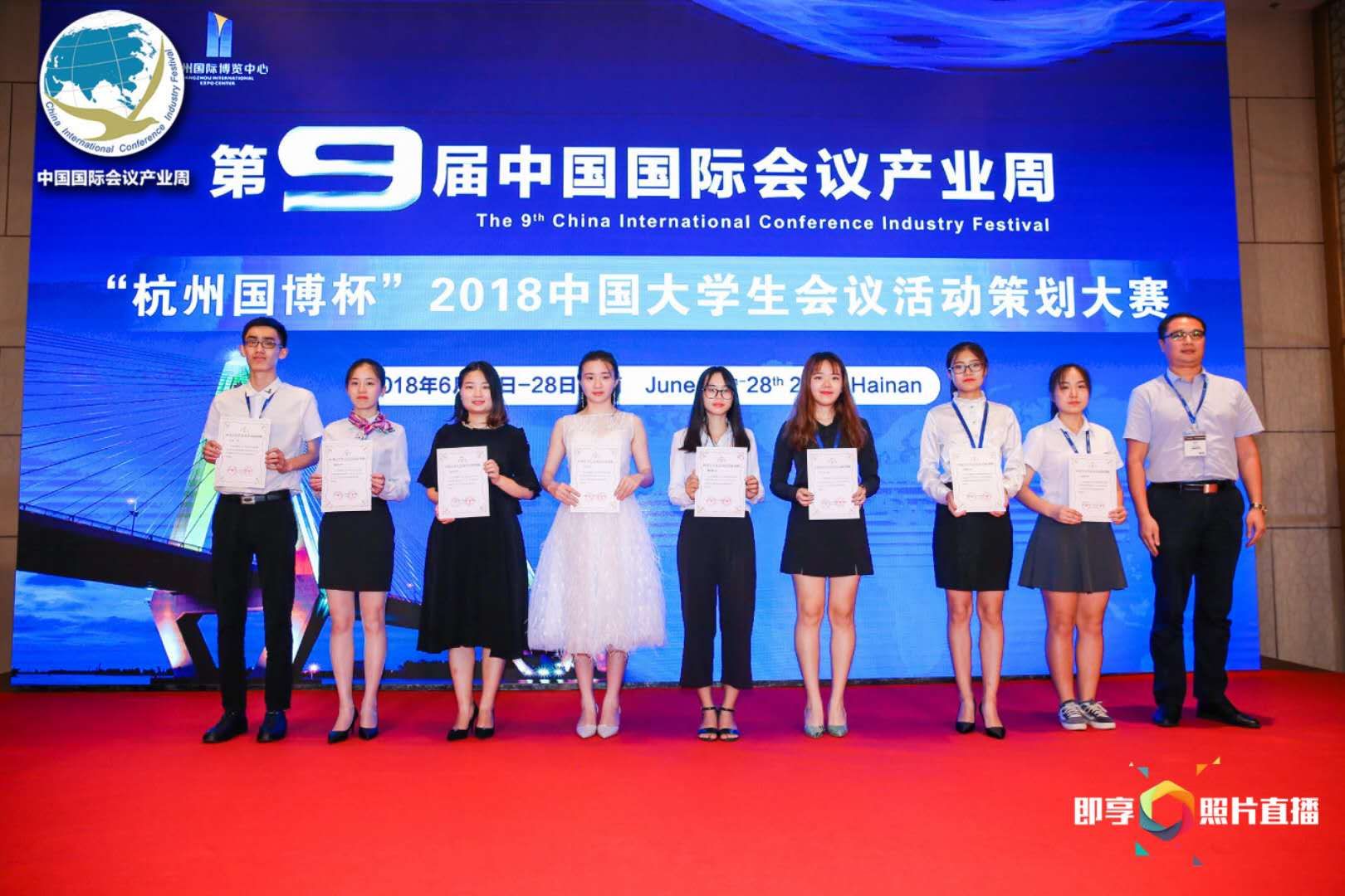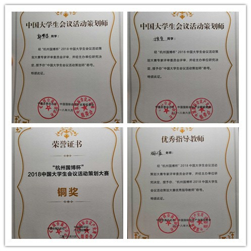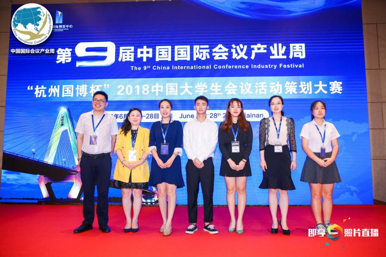 2018年6月25-26日,太阳成集团122ccvip派出代表队参加了在海口举办的“杭州国博”杯2018中国大学生会议活动策划大赛,荣获大赛决赛铜奖,指导老师烟小康荣获了优秀指导教师的殊荣。