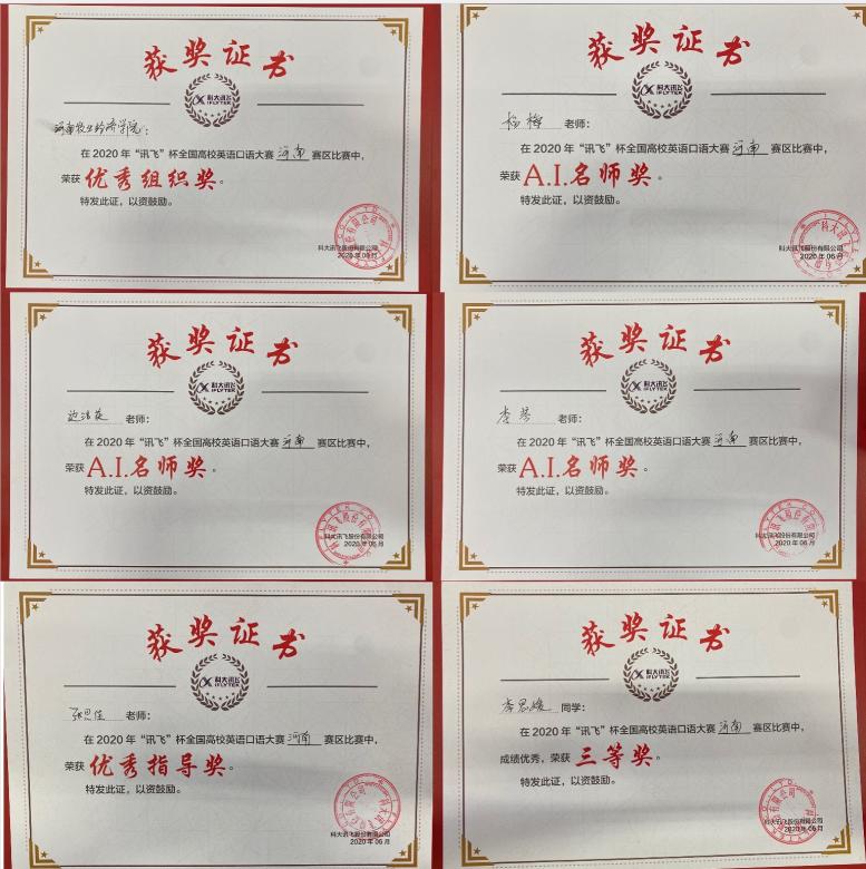 近日,我校收到2020年“讯飞杯”全国高校英语口语大赛组委会颁发的获奖证书和奖品。在此次比赛中,太阳成集团122ccvip获得“优秀组织奖”, 张思佳老师获得“优秀指导奖”,太阳成集团122ccvip杨梅、李琴、边洁英三位教师获得“A.I.名师奖”,工商管理学院李思媛同学获得三等奖。