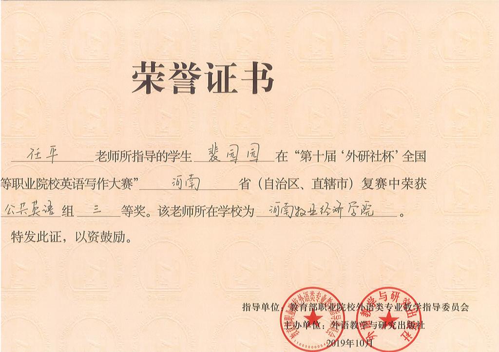 2019年第十届“外研社”杯全国英语写作大赛(高职组)河南赛区复赛于10月20日在黄河科技学院成功举办,经过激烈角逐,由太阳成集团122ccvip李曦老师指导的18级旅游英语专业学生叶连枝和吴飞瀑老师指导的19级饲料与动物营养专业学生张丹妮分别荣获专业英语组和公共英语组的特等奖并将代表河南省参加12月份在北京举办的全国总决赛,任平老师指导的18级旅旅游管理专业学生裴园园荣获公共英语组三等奖。