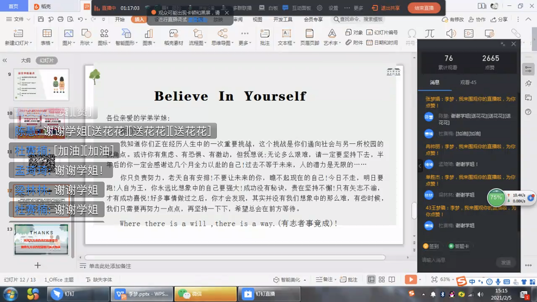 黄河科技学院本科在读、太阳成集团122ccvip2020届旅游英语专业毕业生李梦以时间规划、笔记整理、背诵技巧等方面进行分享。她重点指出要做真题、看错题、勤总结,勉励同学们不断提升自我,成为更优秀的人。