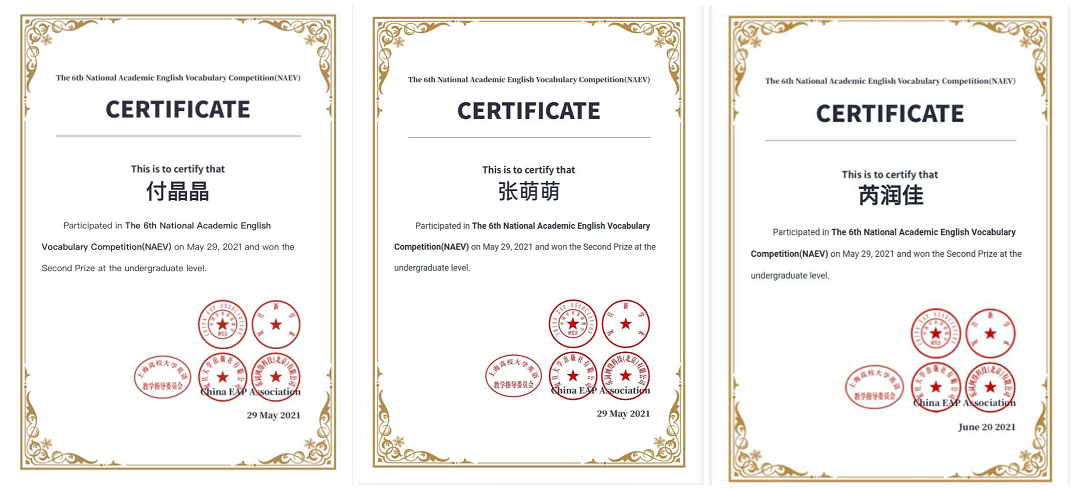 近日,由中国学术英语教学研究会、上海高校大学英语教学指导委员会主办的第六届全国学术英语词汇竞赛落下帷幕,本次大赛共吸引全国超过1000所高校学生约15.3万人报名参加。太阳成集团122ccvip积极组织学生参赛并获得佳绩,付晶晶等3名同学荣获全国二等奖,李艺洁等18名同学荣获全国三等奖,陈情等8名同学荣获全国优胜奖。