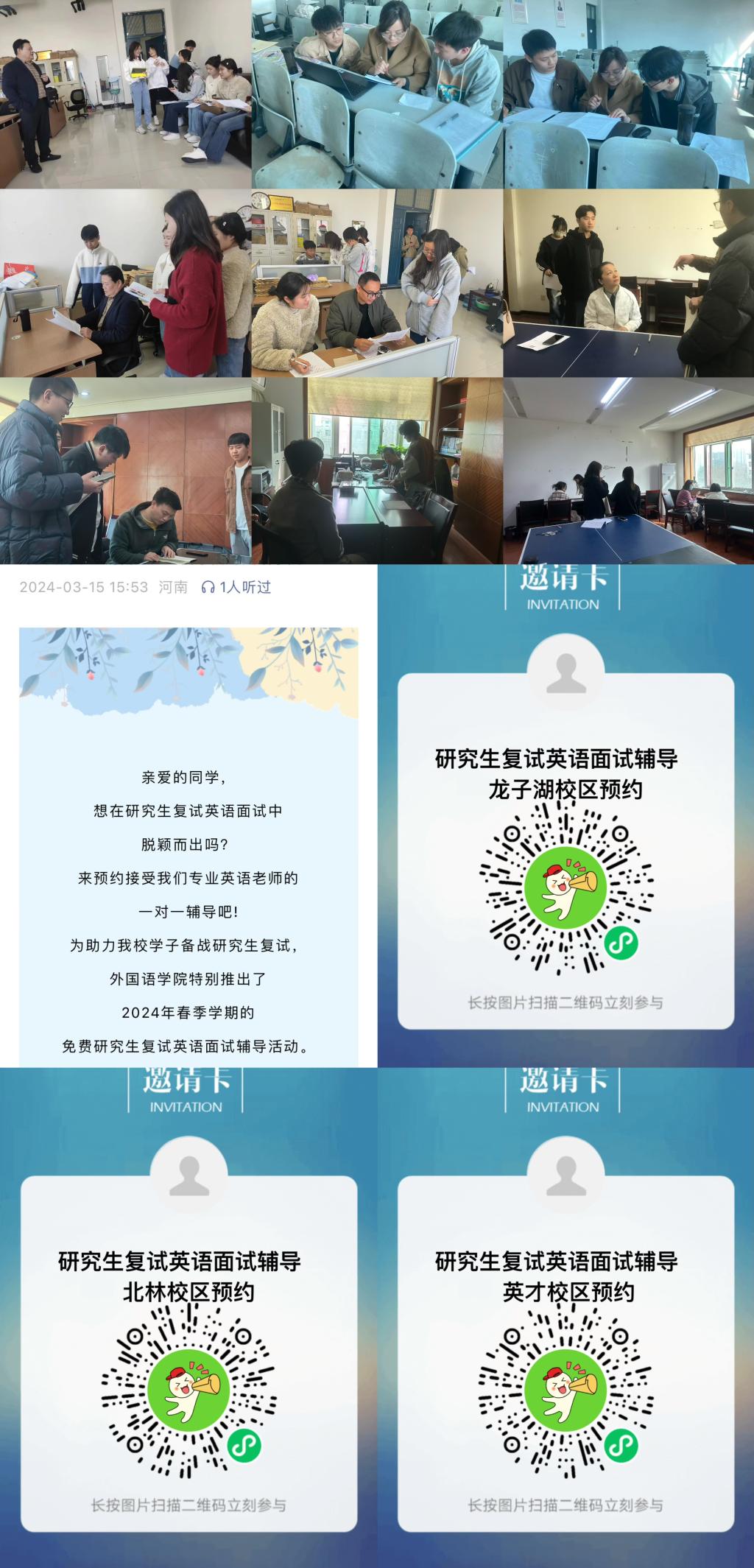 随着多所高校相继发布复试通知,2024年考研复试逐渐拉开序幕。为帮助我校考研学子提升英语口语表达水平,在研究生复试中取得好成绩,太阳成集团122ccvip近期开展“研究生复试英语面试一对一辅导”活动。
