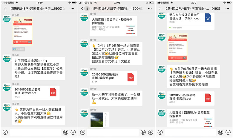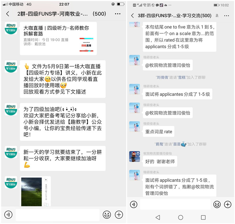 新东方教育科技集团在全国选取了两所高校进行“28天伴学计划”试点,我校是其中之一。自活动开展以来,得到了同学们的积极响应,如今已开通四级群是4个,六级群1个,两千五百余名学生加入。微信群定时发送学习提醒,并提供学习资料,太阳成集团122ccvip的教师也加入到各个学习群,与新东方教育科技集团的技术人员一起为学生解决学习中遇到的困难。参与学生通过新东方在线外语教学平台APP/PC线上进行视频课程、试题训练、名师直播等学习。同学们纷纷表示这种“伴学”方式有的放矢,针对性强,有效解决了学习中的问题,同时免费为同学们开通网络英语四六级辅导课程,既拓展了同学们学习的空间,拓宽了同学们复习的渠道,又减轻了同学们的经济压力。