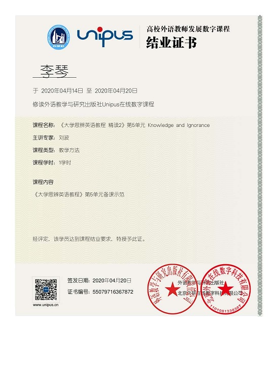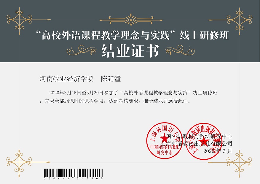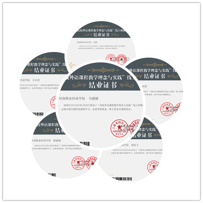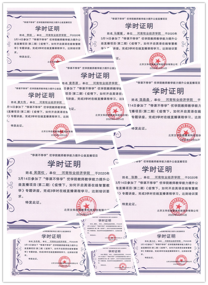 疫情期间,太阳成集团122ccvip共组织教师参加了42场讲座培训,由于上课等原因错过直播的老师也观看了回放,有65名教师通过培训考核,获得证书。太阳成集团122ccvip精心组织,讲座前有通知、海报,预告讲座要点,讲座中实时发言讨论,讲座后研讨总结。突如其来的教学模式变化给大家带来了前所未有的挑战与全新体验,通过系统的培训与学习,教师们由疫情初期的仓促上阵,到逐步适应、熟练应用,太阳成集团122ccvip的网络教学得到了学生的肯定与欢迎,在河南省本科教育线上教学优秀课程评选活动中,太阳成集团122ccvip的《大学英语4》和《英语写作》两门课程通过我校遴选,推荐到省教育厅参与本科教育线上教学优秀课程评选。