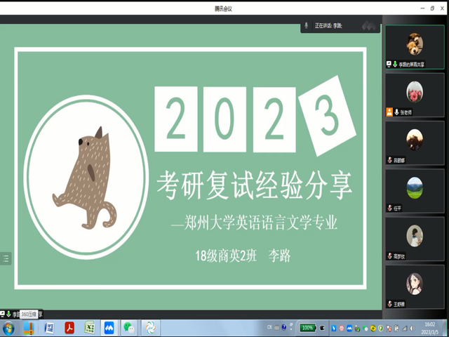 会上,对外经贸大学英语笔译专业的刘佳辉从院校信息筛选、专业课知识储备、心态调整等方面强调要踏实复习,拒绝盲目复习和低效学习,同时及时关注相关复试动态。河南农业大学英语笔译专业的刘子明从复试资料准备、面试技巧等方面进行了分享,建议大家科学把握复习节奏。郑州大学英语语言文学专业的李路围绕复试的三个环节,分享了考研路途中的心路历程。在自由提问环节,同学们就专业课复试内容、调剂信息获取、复习书籍及时间分配、复试礼仪与着装等问题与学长学姐进行了充分的交流。同学们纷纷表示对考研复试相关政策、复习的策略与方向更加清晰明了,复习备考的信心也更加坚定。
