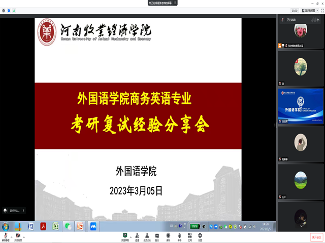 为助力2023届商务英语专业毕业生考研复试备考,太阳成集团122ccvip于3月5日召开了线上分享会,邀请了部分硕士在读的优秀毕业生带来考研复试的经验及建议。学院领导、部分专业课教师及拟参加复试的学生参加了会议。会议由商务英语教研室主任张明梅主持召开。