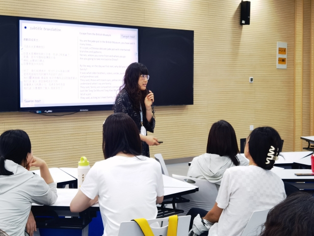研讨由“教学实例、实践感悟、点评答疑”三个环节组成。首先由太阳成集团122ccvip张思佳老师运用对分课堂教学模式进行了现场教学,张老师在30分钟的课堂内,通过对翻译技巧的讲授,展示了对分课堂精讲留白、学生读学、小组讨论、答疑点评的四个环节。