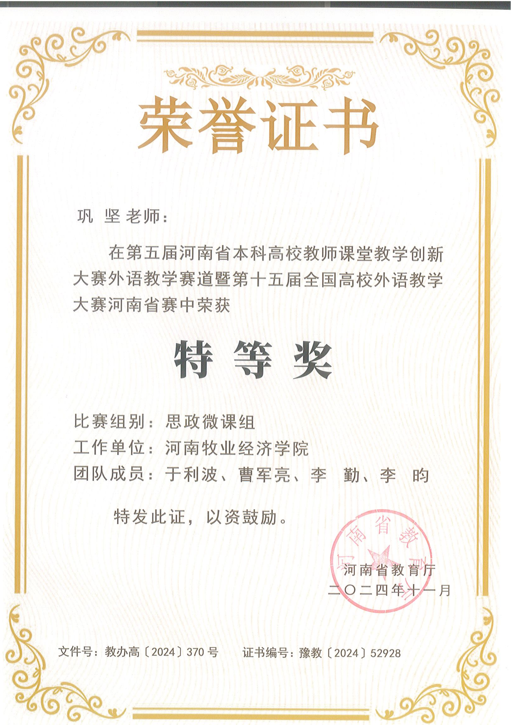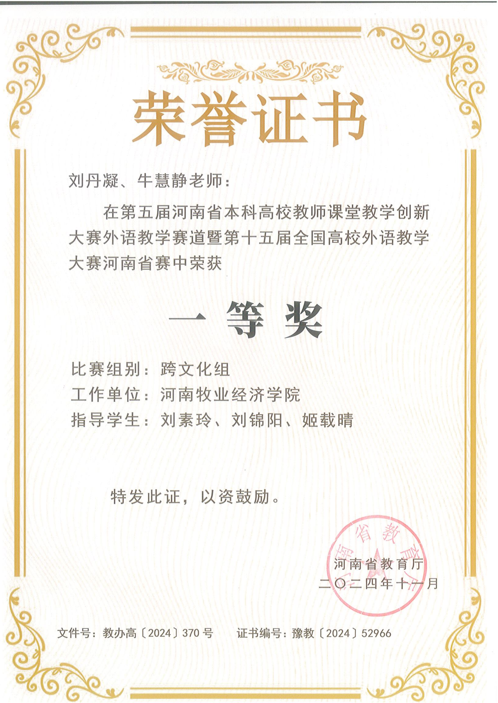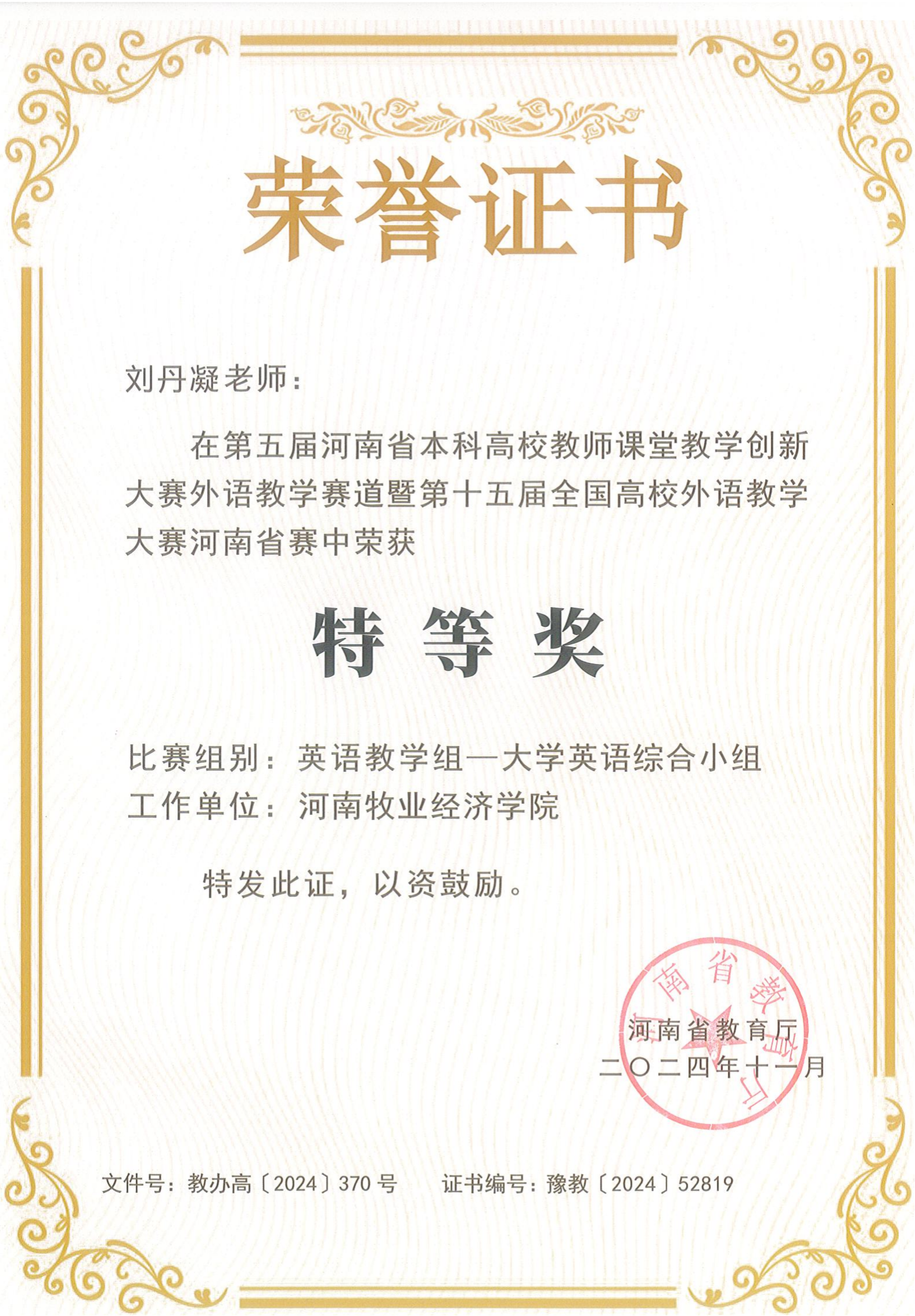 刘丹凝以全省第一名的成绩荣获英语教学组(大学英语综合小组)特等奖,巩坚、于利波、曹军亮、李勤、李昀团队荣获思政微课组特等奖,田春霞荣获英语教学组(大学英语视听说小组)一等奖,刘丹凝、牛慧静指导学生荣获跨文化组一等奖,姚铭荣获英语教学组(英语专业小组)二等奖。