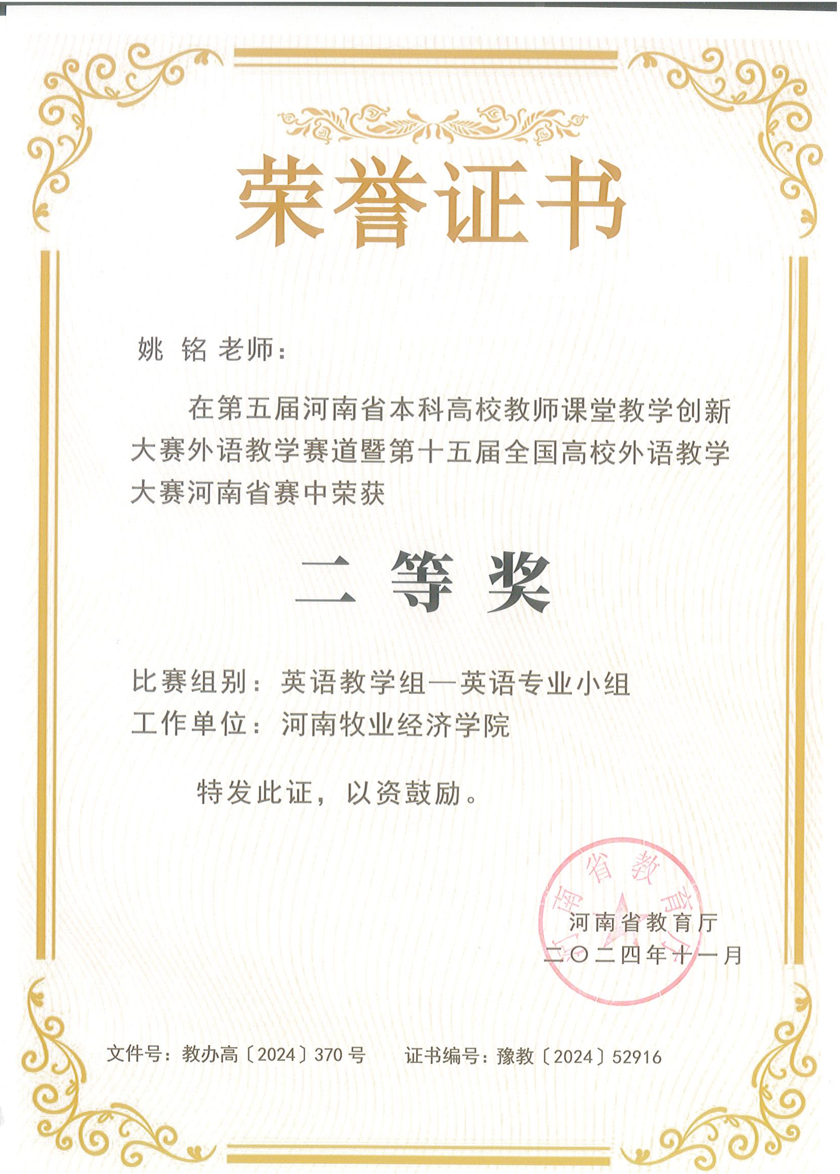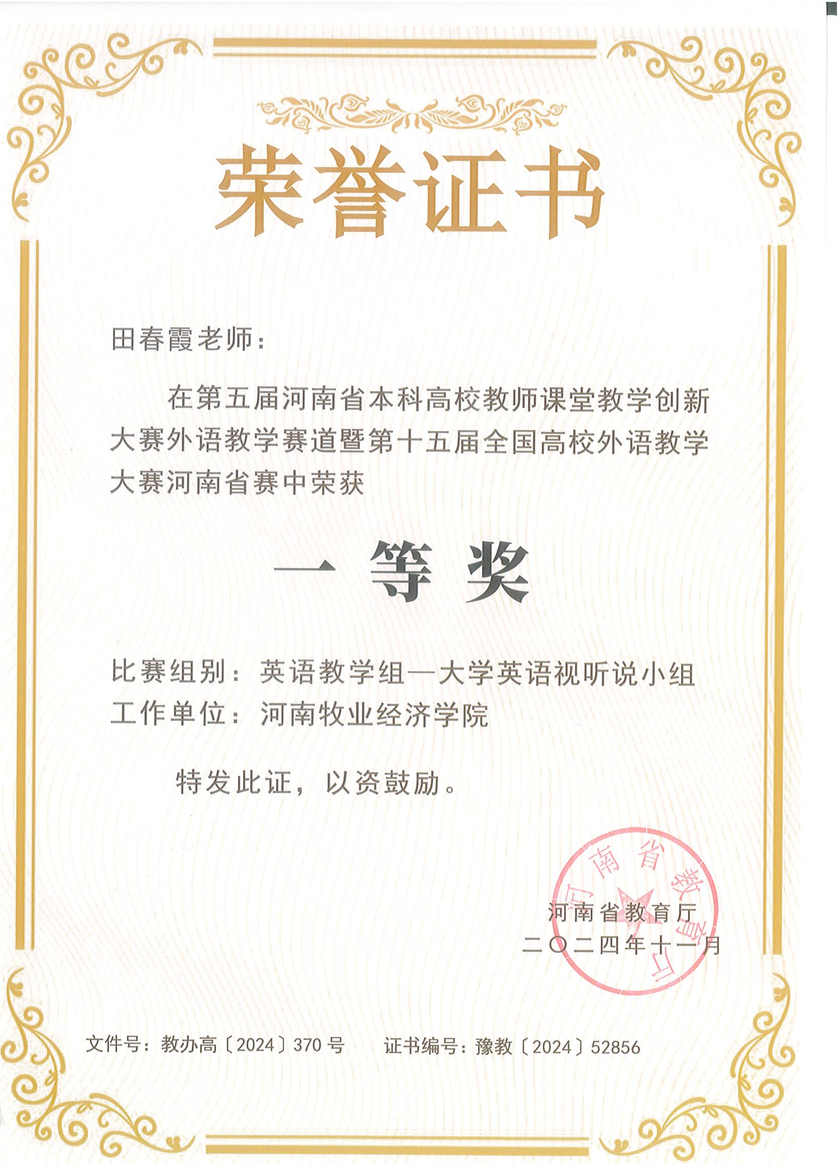 近日,河南省教育厅发文公布第五届河南省本科高校教师课堂教学创新大赛外语教学赛道暨第十五届全国高校外语教学大赛河南省赛获奖名单,我校参赛教师在英语教学组、思政微课组和跨文化组三个小组五项赛事中荣获特等奖两项,一等奖两项,二等奖一项,取得我校参赛最佳成绩。