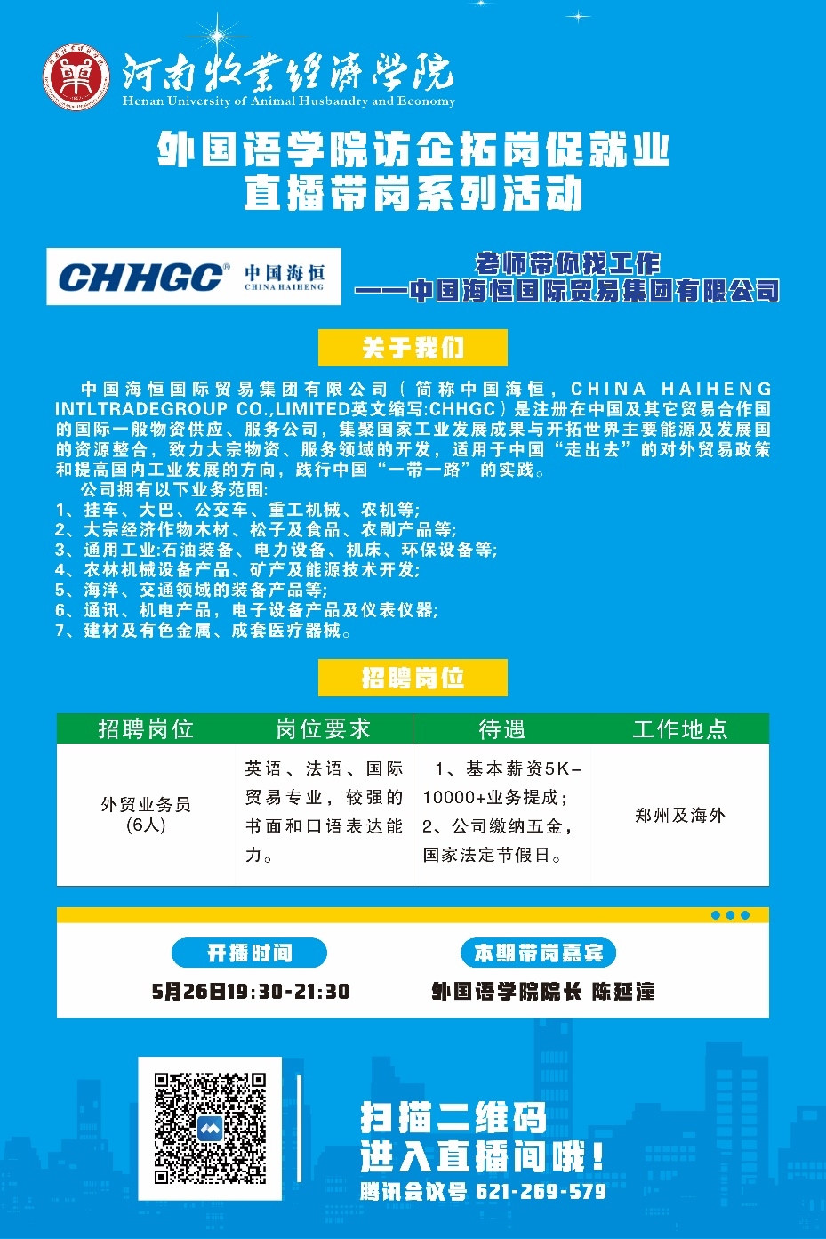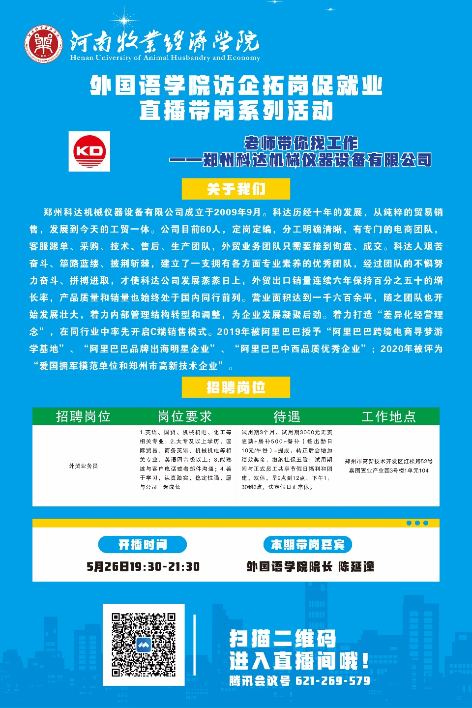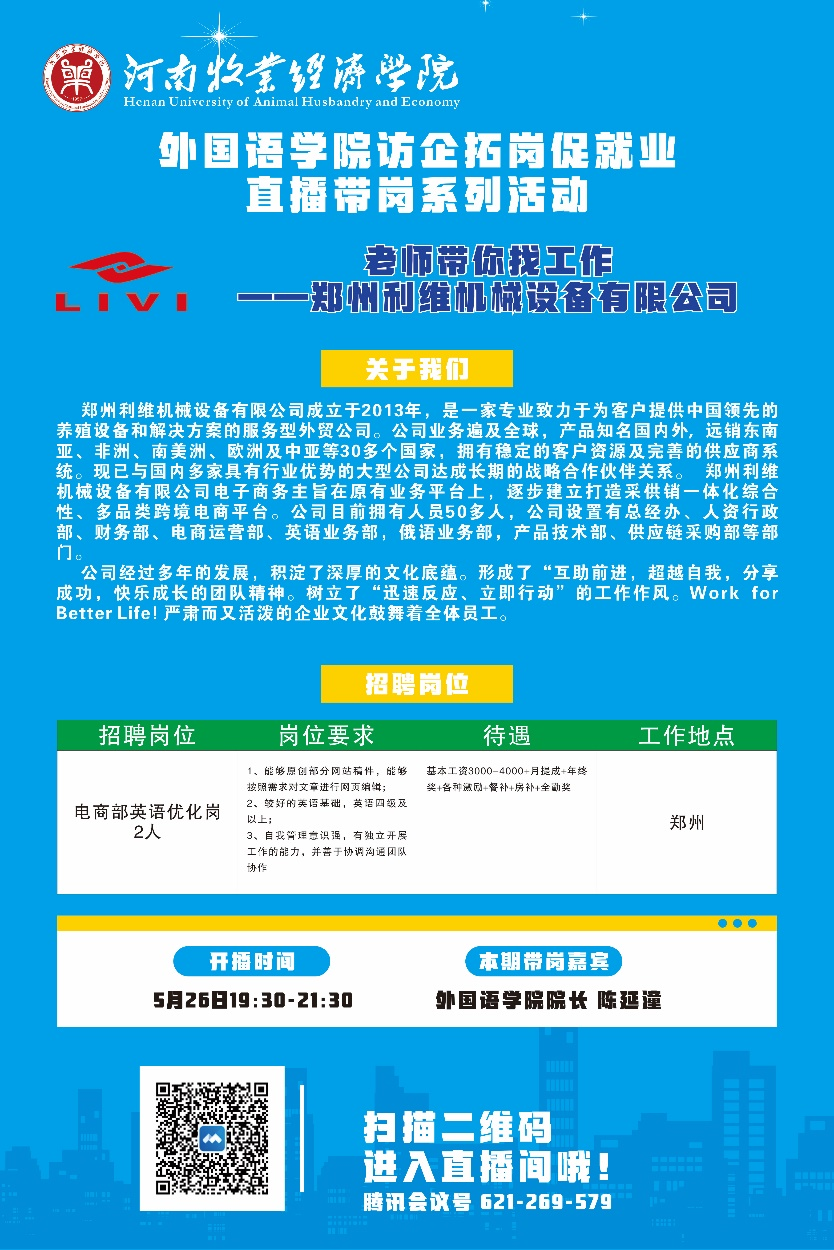 5月26日晚,太阳成集团122ccvip首场商务英语专业直播带岗专场招聘会顺利举办,本次直播带岗由太阳成集团122ccvip院长陈延潼主持,河南海恒国际贸易集团有限公司、郑州利维机械设备有限公司、郑州科达机械仪器设备有限公司三家企业应邀进入直播间,通过直播间互动交流,针对广大毕业生关心的企业概况、招聘岗位、薪资福利、工作地点、岗位需求、发展前景等问题进行宣讲,并现场连线作答,与毕业生进行热烈的交流互动,并对有意向的毕业生进行了初步的线上面试。