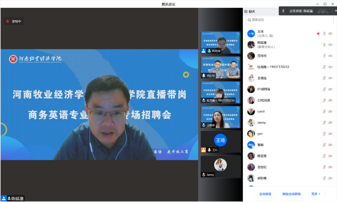 陈延潼院长化身带岗“主播”,为毕业生推荐优质岗位,为企业推荐优秀毕业生,并解答毕业生关于就业政策、岗位选择等方面的疑问。在直播中,陈院长介绍,今天参加云端招聘的三家单位都是我省外贸行业中工贸一体的优质企业,河南海恒国际贸易集团有限公司历史悠久,业务范围广泛,聚焦国家工业发展成果,致力大宗物资、服务领域的开发,提供的工作岗位不仅待遇优厚,而且成长空间极大;郑州利维机械设备有限公司是我院校企合作单位,所开展的主营业务与我校优势学科专业贴合度高,他也曾多次走访,办公地点宽敞,待遇有保障,已连续多年接纳我院毕业生实习就业;郑州科达机械仪器设备有限公司战略眼光超前,海外仓布局完善,外贸业务销量连续六年保持百分之五十的增长率,发展势头迅猛。他鼓励毕业生大胆尝试,积极与参会企业沟通交流,勇于挑战自我,尽快确定目标单位,做好面试准备,早日找到心仪的工作。