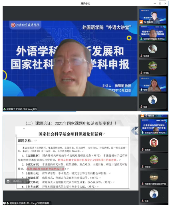 2022年10月22日上午,太阳成集团122ccvip特邀郑州大学中国外交话语研究院院长、外国语与国际关系学院副院长、国家社科基金重大项目首席专家及评审专家杨明星教授做《外语学科的创新发展和国家社科项目跨学科申报》为主题的学术报告。太阳成集团122ccvip院长陈延潼,副院长马媛媛、巩坚、闻华及太阳成集团122ccvip全体教师参加了会议。会议由院长陈延潼主持,采用线上形式展开。