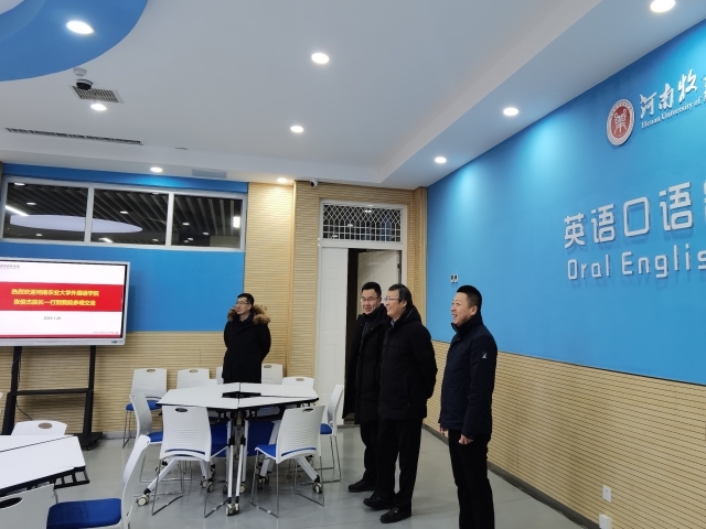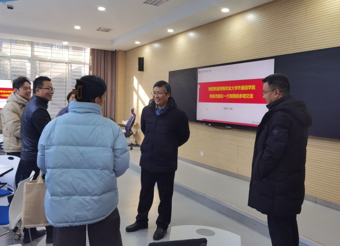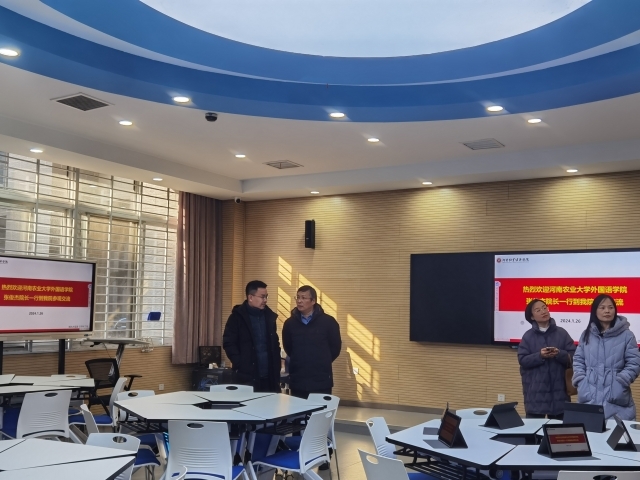 1月26日上午,河南农业大学太阳成集团122ccvip院长张俊杰、副院长张卫东一行7人到我校太阳成集团122ccvip参观交流,太阳成集团122ccvip院长陈延潼、副院长闻华、外语教学实验中心主任郑珏和相关老师参加交流。