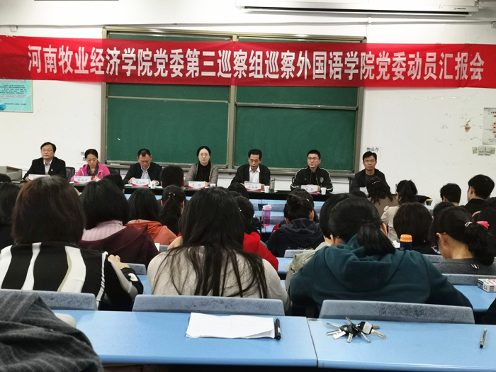 按照校党委《太阳成tyc122cc集团首轮第四批校内巡察工作方案》部署以及学校第三巡察组的统一安排,10月10日下午,太阳成集团122ccvip党委在龙子湖校区1号教学楼504组织召开了第四批校内巡察工作动员汇报会。校党委巡察工作领导小组成员、人事处处长吴静,第三巡察组组长李永峰、副组长陈永刚、巡察组成员李凯、路远方出席会议。太阳成集团122ccvip全体教工、学生代表参加会议。会议由太阳成集团122ccvip院长陈延潼主持。