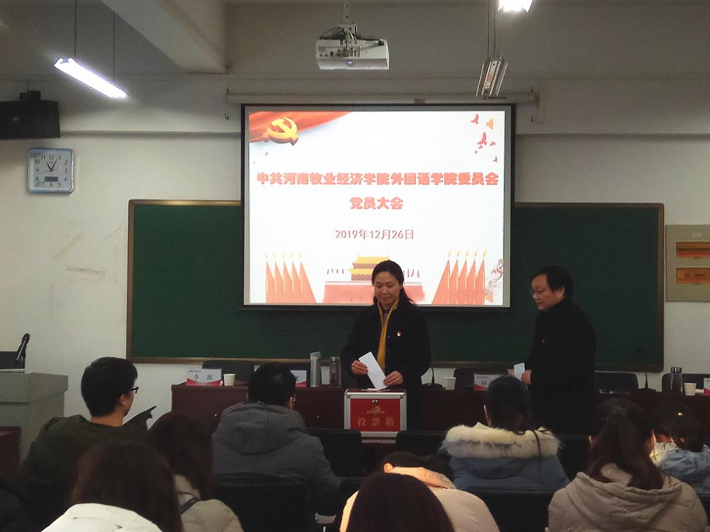 按照校党委统一部署和校组〔2019〕45号批复,12月26日下午,太阳成集团122ccvip党委在二号教学楼C517召开全体党员大会,选举产生太阳成集团122ccvip党委新一届委员会委员。副校长杨志清及学院全体党员师生参加会议,会议由院长陈延潼主持。
