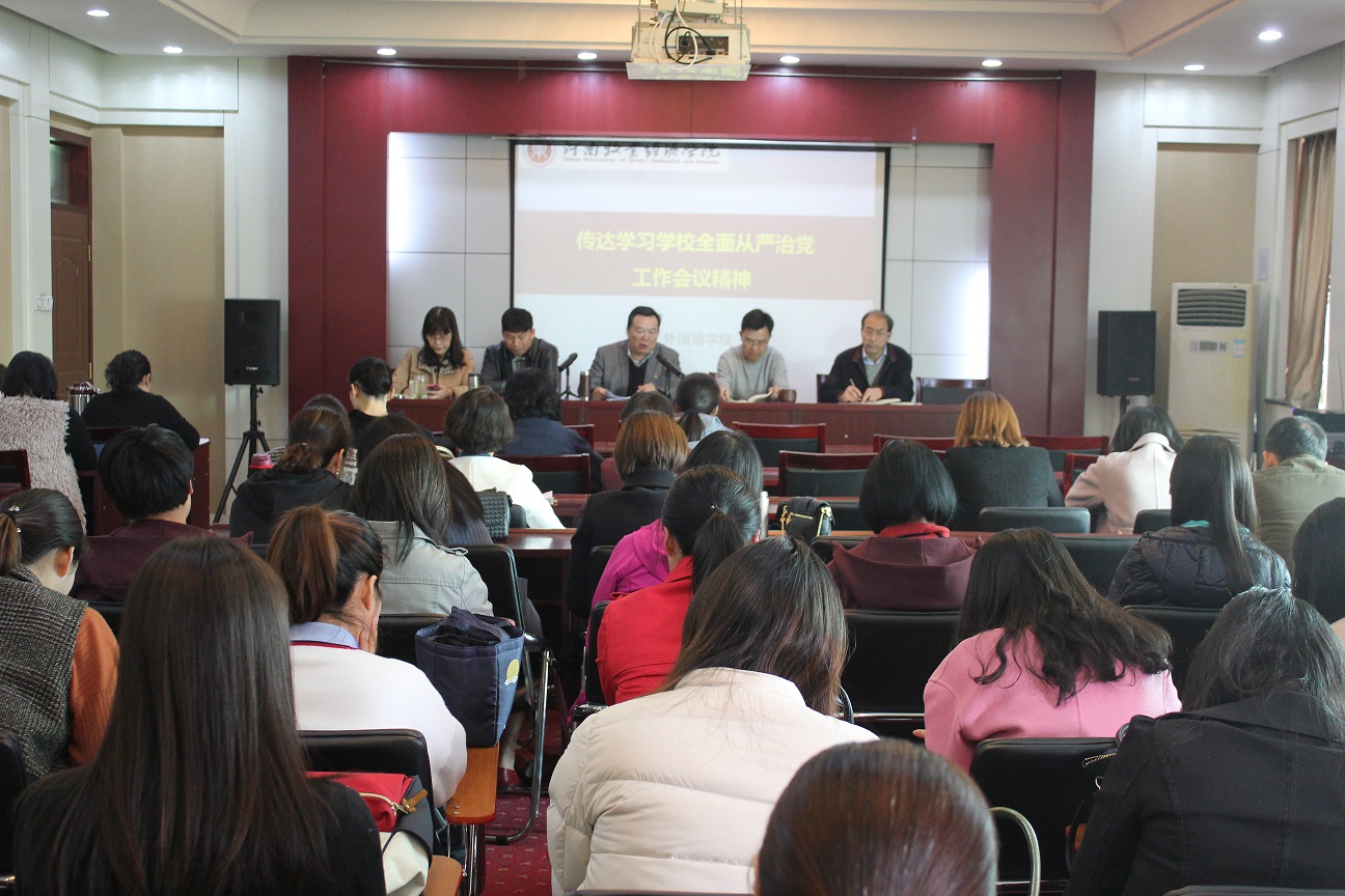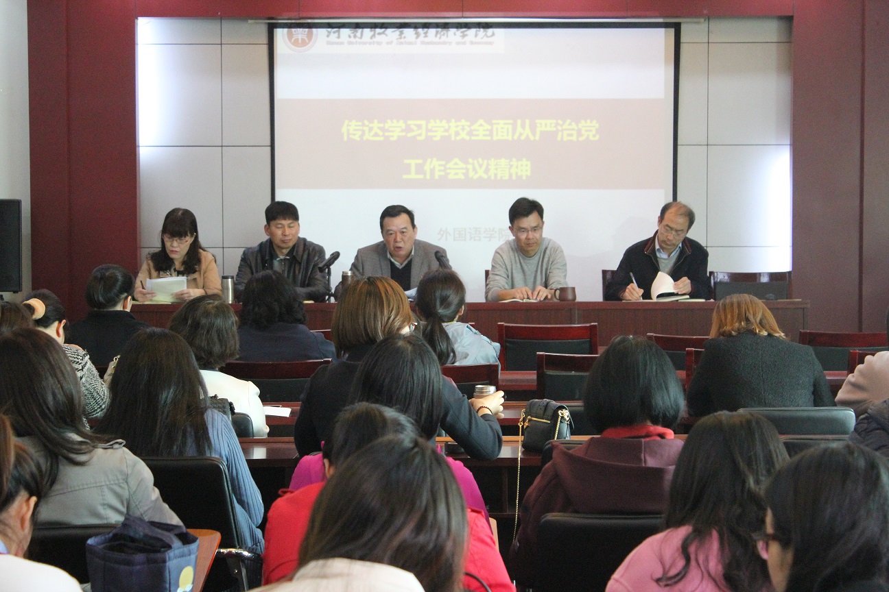4月11日下午,我院组织全体教工召开了全面从严治党工作会议,传达落实学校2019年全面从严治党工作会议的精神及学校关于省委巡视反馈问题整改动员大会的会议内容。会议由党总支书记弓峰山主持召开。