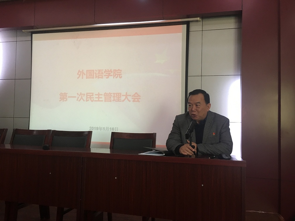 党总支书记、分工会主席弓峰山做了总结发言,他指出:民主管理大会的目的就是畅通渠道,汇集智慧,凝聚人心,我院作为学校融合发展的代表,既要做好学科专业建设,又承担着三个校区公共外语教学的繁重任务,我院通过抓班子带队伍促融合、抓党建带业务促发展,强化师德师风教风学风建设,初步形成了风清气正、团结和谐,积极向上的干事创业氛围,成绩的取得得益于大家的精诚团结和无私奉献;在新的一年希望大家开心工作、幸福生活,继续凝心聚力,实现我院持续、和谐、健康发展,弓书记代表院党政领导班子祝福大家新春快乐、喜乐安康、阖家幸福。