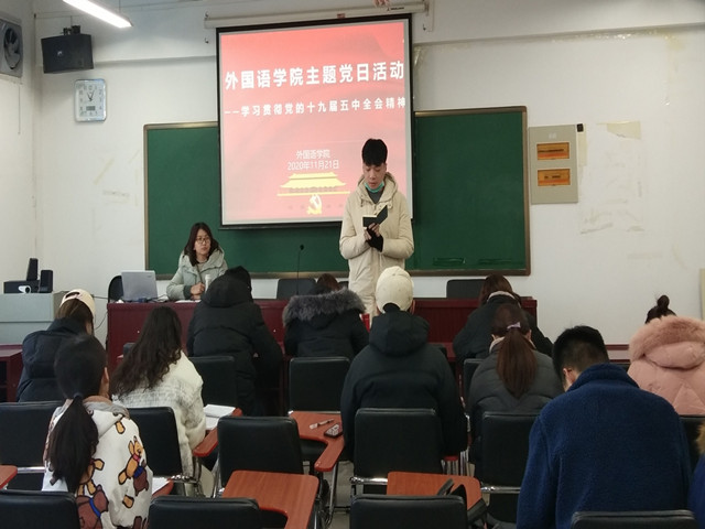 为深入学习宣传贯彻党的十九届五中全会精神,提升学生党员的思想政治素质,12月19日,我院在c517开展了主题党日活动,参与此次活动的有我院党委副书记李燚,辅导员及学生党员。