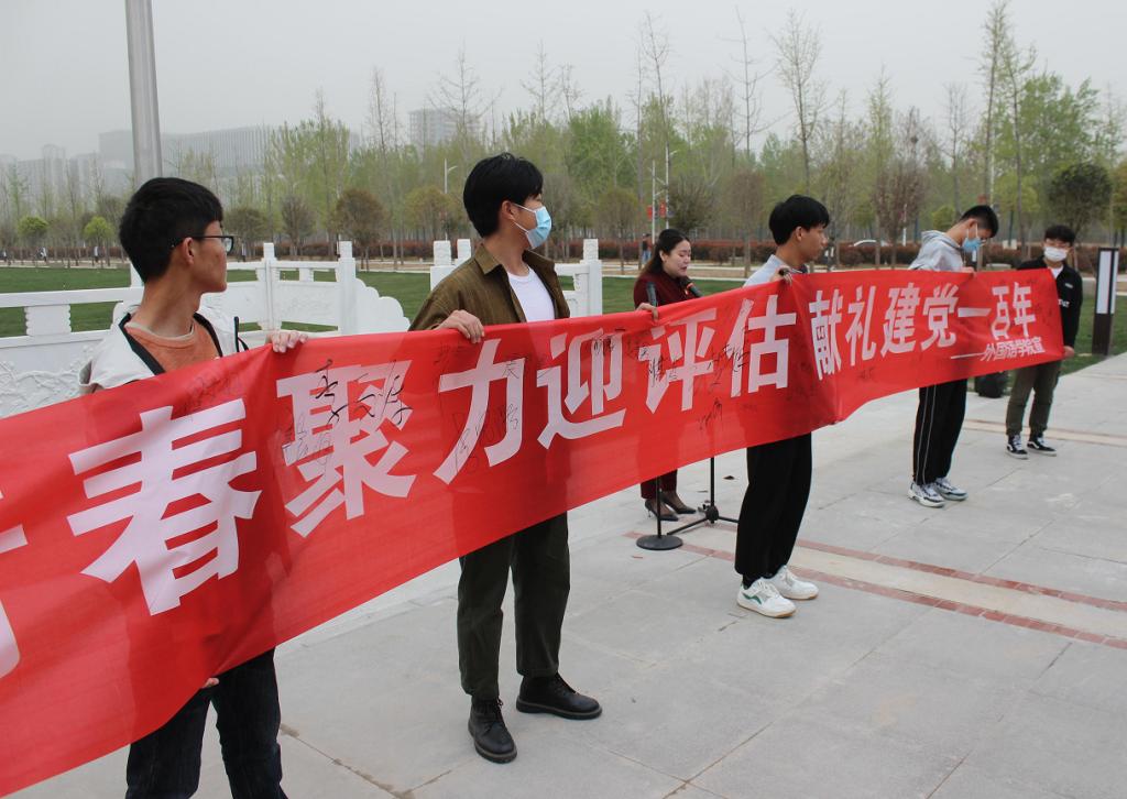 仪式最后,大家合唱《没有共产党就没有新中国》。伴随着嘹亮的歌声,学生党员及学生代表在“青春聚力迎评估,献礼建党一百年”年”横幅上签字明誓。