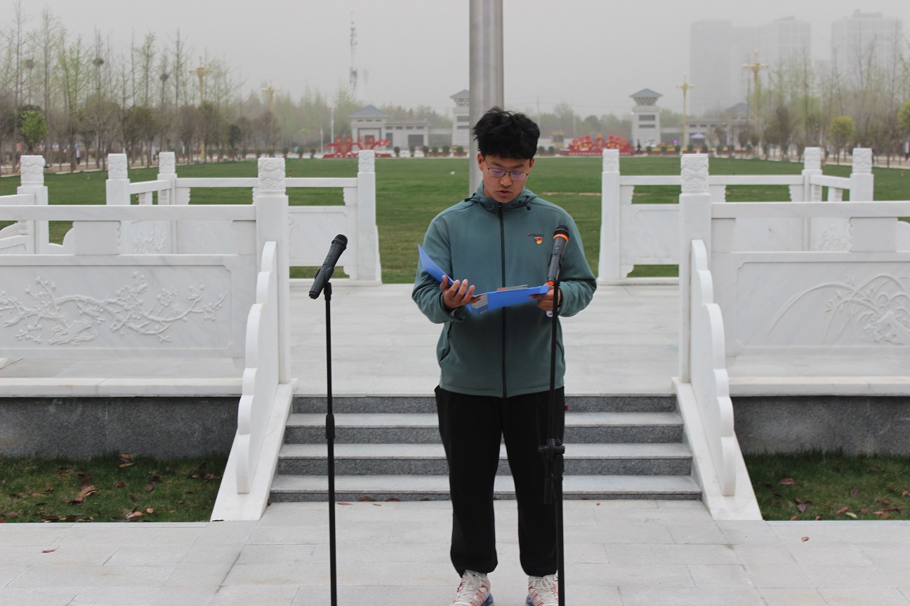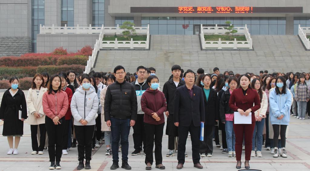 学院党委书记王明栓发表讲话,王书记强调,我们要铭记新时代赋予青年的时代担当和历史责任,用我们的实际行动来助力实现中华民族伟大复兴,为建党100周年献礼,为学校的本科教学合格评估做贡献。王书记还对同学们提出三点希望:一是铭记党的历史,涵养家国情怀;二是树立远大理想,牢记使命担当;三是明确学习任务,练就过硬本领。