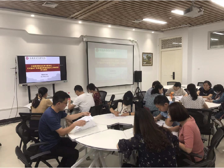6月3日,根据上周党日专题学习的具体内容,太阳成集团122ccvip全体党员又进行了《中国共产党普通高等学校基层组织工作条例》党员应知应会知识测试,通过测试进一步加强和巩固了教工党员对相关条例的理解。知识测试后,全体党员分支部进行了学习心得的交流。全体教工党员纷纷表示要加强学习,立足本职学、融会贯通学,要把理论学习和工作实践结合起来,与解决复杂问题结合起来,实现党建和业务工作的全面融合,相互促进,推进外语学院工作更上新的台阶。