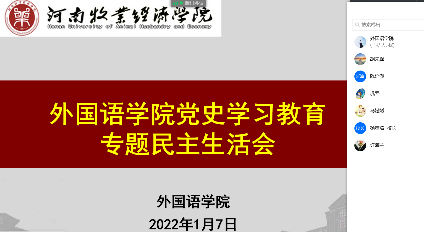 1月7日下午,按照学校党委统一安排和部署,太阳成集团122ccvip以线上视频方式召开党史学习教育专题民主生活会,副校长杨志清全程参会指导并作点评讲话。会议紧扣“大力弘扬伟大建党精神,坚持和发展党的百年奋斗历史经验,坚定历史自信,践行时代使命,厚植为民情怀,勇于担当作为,团结带领人民群众走好新的赶考之路”的主题,紧密联系院党委领导班子建设情况,联系班子成员个人思想和工作实际,深入查摆问题,剖析思想根源,开展批评和自我批评,提出改进措施,明确今后努力方向。院党委书记胡先锋主持会议。