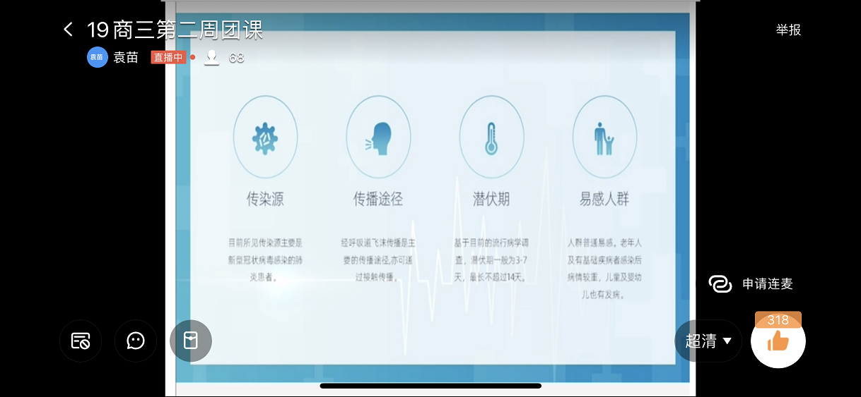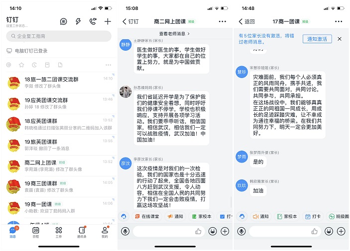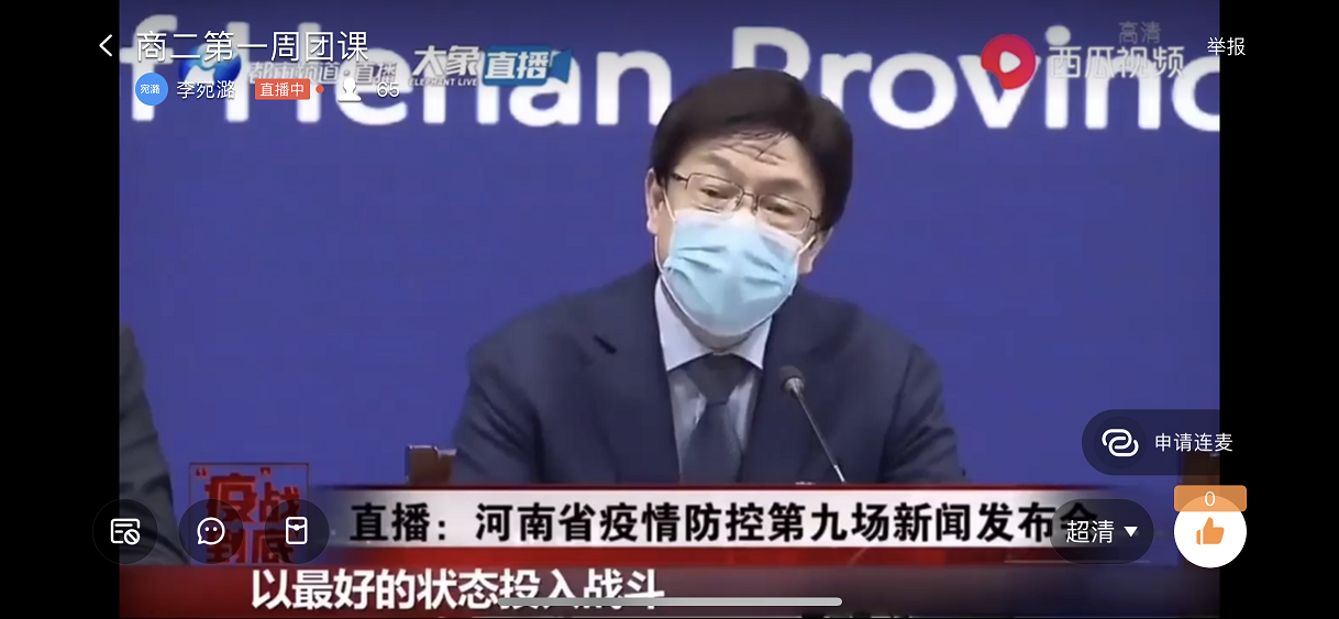 团课上,各班团支书利用钉钉直播软件,首先组织大家观看学习了河南省教育厅党组书记、厅长郑邦山在“河南省新型冠状病毒感染的肺炎疫情防控工作”第九场新闻发布会上的讲话19商英01班团支书张雨微谈到“在聆听了郑厅长的发言后,感受颇深,心潮澎湃,懂得了打赢这场“战争”的重要性我们共青团员要听从学校安排,保持联络畅通,不提前返校,每日积极汇报健康情况,不听谣不传谣,为打赢这场防疫战贡献力量。商务英语二班,主持人精心制作了PPT为大家讲述身边人在抗击疫情中的感人故事。同时,积极展开线上互动,同学们争先恐后回答相关问题,活跃的氛围感染着每个同学。应用英语班主要以图文形式,直观的让大家学习在新冠病毒面前应该如何做、怎样做得更好。旅游英语班采用播放视频的方式,让同学们深切感受到了万众一心、攻坚克难的“中国力量”副书记李燚辅导员田春霞、刘萌、李昀老师深入各团支部,与团员青年们一起学习防疫知识,并引导团员青年遵守各项防控规定,督促大家踏实勤奋抓好学业。
