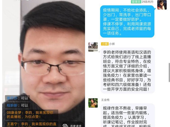 18级辅导员李昀老师采用钉钉直播为全年级学生分专业召开了线上班会。同时李老师结合每个专业特点和当下形势采用英汉双语直播,向同学们传达了学校、学院防疫工作的相关安排和要求。讲解了大学生如何做好新型冠状病毒疫情防控工作、返校前的注意事项、任课老师网上直播课程注意事项等方面内容。此外,李老师鼓励大家发挥专业优势,深挖此次疫情防控相关英文表达,向学生群里转发外文局审定的有关新冠病毒疫情防控相关中英词汇,让同学们学习。李老师也对同学们提出了忠告和希望,希望同学们在家里积极学习课程知识,并加强锻炼,增强体魄。