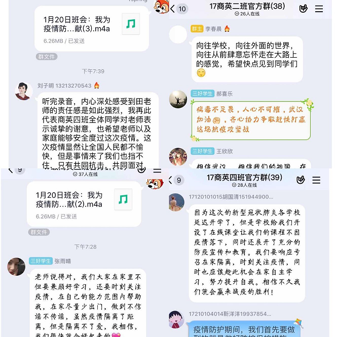 本次班会中同学们热情参与、积极讨论,对于本次疫情有了更加深入的了解,对于各个层面的通知要求有了更多的理解。大家纷纷留言表示一定会响应号召,一切听从指挥,并且认真参与线上学习,提高自主学习能力,准备更好的自己,为社会做出更多的贡献。同时同学们也表达了很多自己的想法,也为我院学生工作队伍有针对性地持续开展工作提出了新的要求和努力方向。