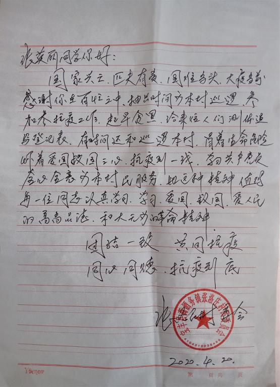 近日,平顶山市宝丰县商酒务镇张洛庄村民委会发来感谢信,对我院2018级应用英语02班张英丽同学在家乡疫情防控工作中的突出表现予以表扬和感谢。
