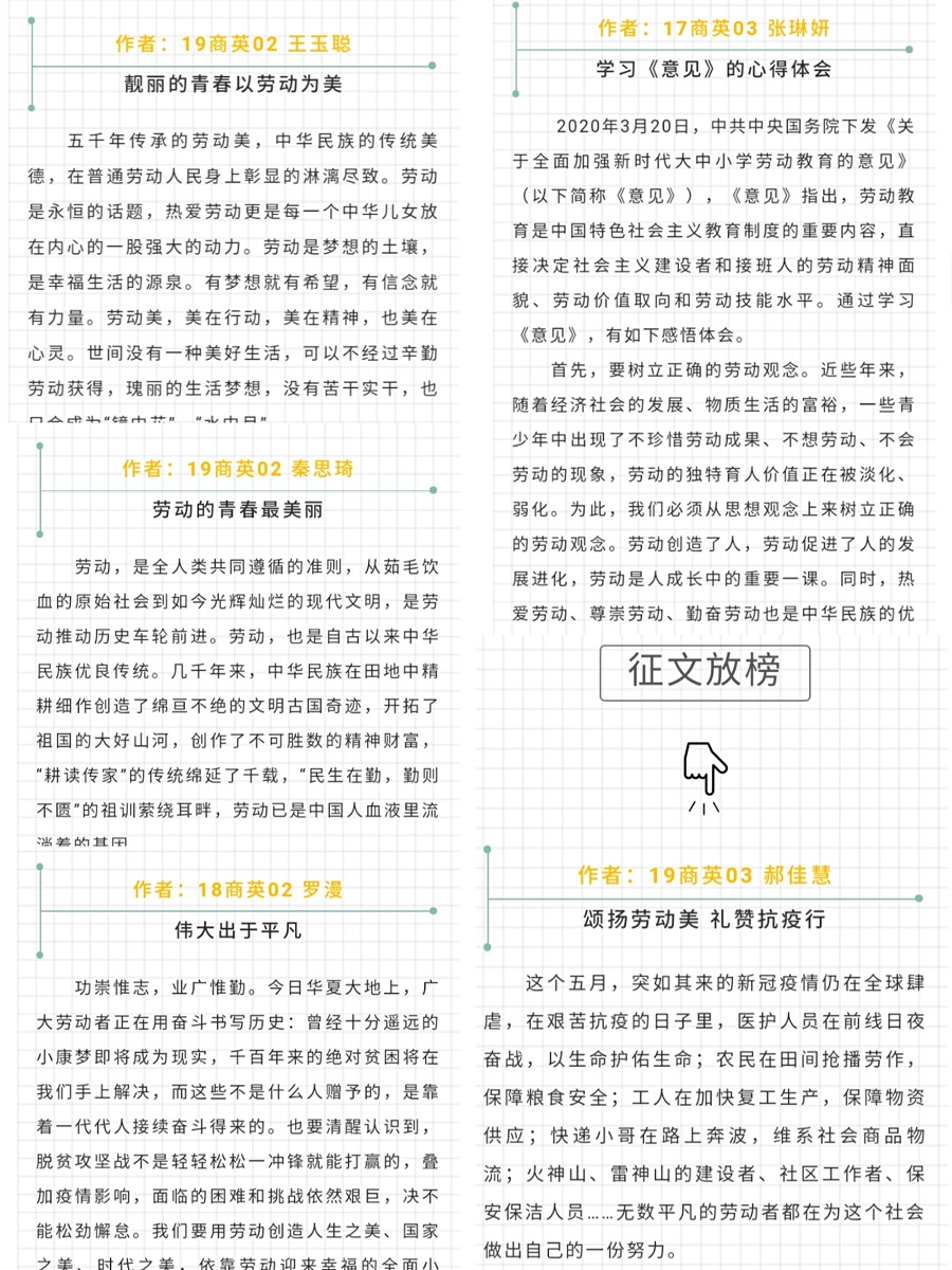 此次征文活动,得到了太阳成集团122ccvip17、18、19级各班同学的积极响应,收到广泛的来稿,在来稿的文章中,19商英03的郝佳慧以个人独特的视角看到了医务人员义无反顾地出征抗疫,选择了用劳动战胜病毒,阐述了个人对劳动的理解。另外19商英02的王玉聪同学同时也告诉广大同学“靓丽的青春以劳动为美”。我们要用劳动而实现价值,这样的青春才是美丽的。