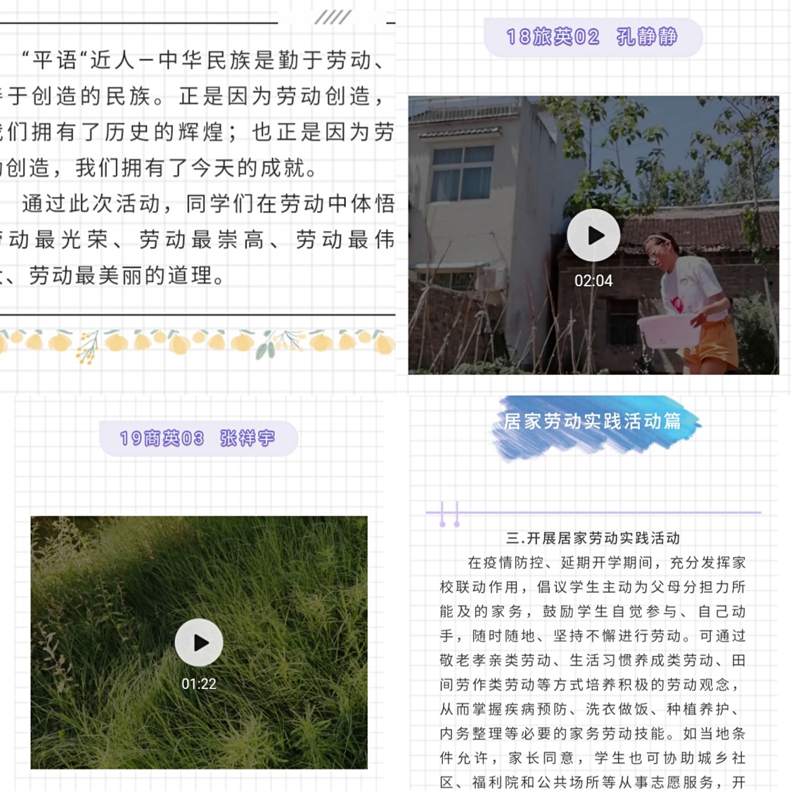 在征集的视频中,18旅英二班的孔静静同学为西瓜、黄瓜等作物浇水施肥,促使作物快速生长,同时也喂养小鸡、兔子等可爱的小动物,帮它们找食物吃,最后也通过自己的劳动吃到了美味的食物,孔静静同学让我们充分感受到了劳动实践的乐趣。19商英三班的张祥宇同学也在视频中帮妈妈做农活,自己动手做了许多美味的饭菜。两位同学的劳动实践都充分展现了劳动的趣味,也让同学们感受到了劳动实践的辛苦与收获的快乐。