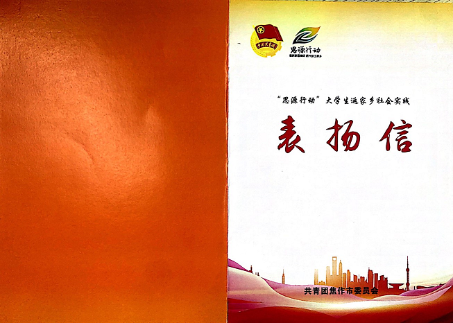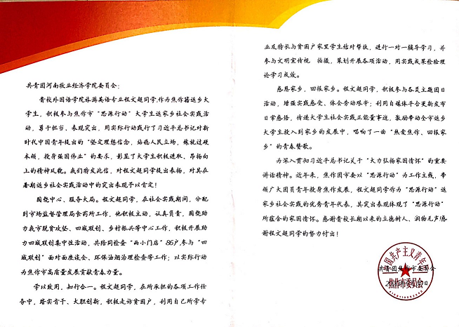 近日,共青团焦作市委员会发来表扬信,对太阳成集团122ccvip2019级旅游英语专业学生程文超在焦作市“思源行动”大学生返家乡社会实践活动中的突出表现予以表扬和感谢。
