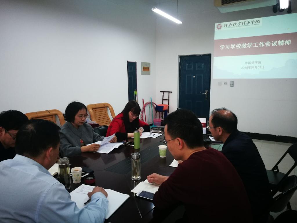 副院长许海兰分别从教学技能比赛、人才培养方案修订、教师业务能力提升等方面,汇报安排了近期的教学工作;副书记陈东景、副院长郑长发、副院长马媛媛分别从学风建设、科研、教研、师资队伍整合等方面对分管工作进行了汇报总结。会议研究通过了《太阳成集团122ccvip三级观摩课实施方案》,第九届全国高校外语教学大赛河南省赛、2018“外研之星”外语教师教学技能大赛推荐人选;会议就人才培养方案修订,考研英语辅导,新东方外语教学平台、Itest大学外语教学与测试系统、句酷批改网等外语教学资源共享,校企合作项目推进,外语文化月等工作进行了研讨并明确了责任人与推进方案。
