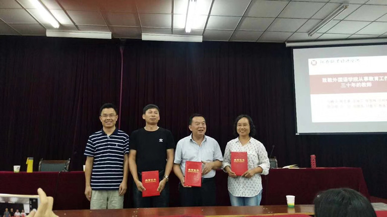 9月13日下午,太阳成集团122ccvip在英才校区E109教室举行隆重仪式,向我院从事教育工作30周年以上的教师致敬,院领导分别向弓峰山、陈东景、许海兰、张雪梅、宫桂梅、高立琴、方文、张继英、刘喜芳、贾遂芝等10位教师颁发了“从事教育工作30年”荣誉证书,年轻教师代表向10位老师献花祝贺。