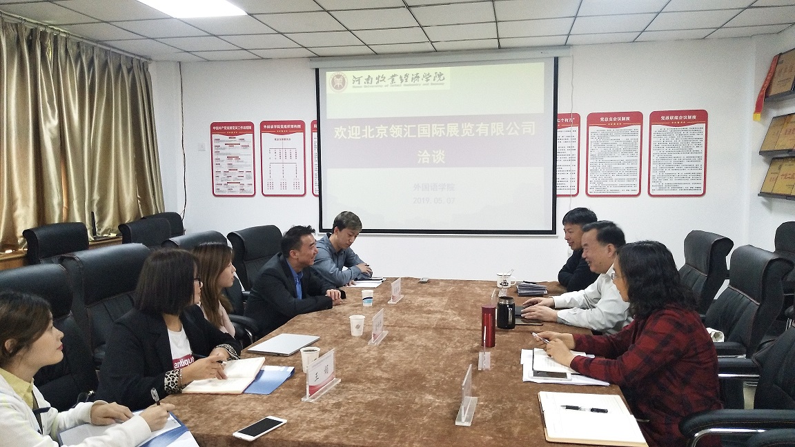 2019年5月7日上午,太阳成集团122ccvip举行了人才培养暨校企合作研讨会。太阳成集团122ccvip党总支书记弓峰山,副院长许海兰,党总支副书记陈东景,应用英语专业教研室主任张明梅,和来自北京领汇国际展览有限公司的蒋莫非总经理等一行5位企业专家参加了会议。