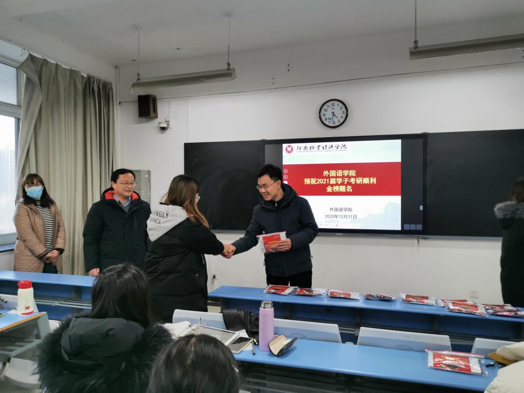 领导老师首先询问了同学们的备考情况和心情状态,肯定了同学们的努力和付出,表达了学院对大家的关心和鼓励。王书记勉励同学们坚持到底,摆正心态,轻松上阵,同时注意身体健康,做好防护,打一场有准备的胜仗。陈院长鼓励同学们要在最后阶段查漏补缺,掌握正确的战略战术,祝大家心想事成、马到成功、一战成硕。最后,领导老师为考研学生发放考研文具礼包和祝福卡片,祝福满满,温暖人心。