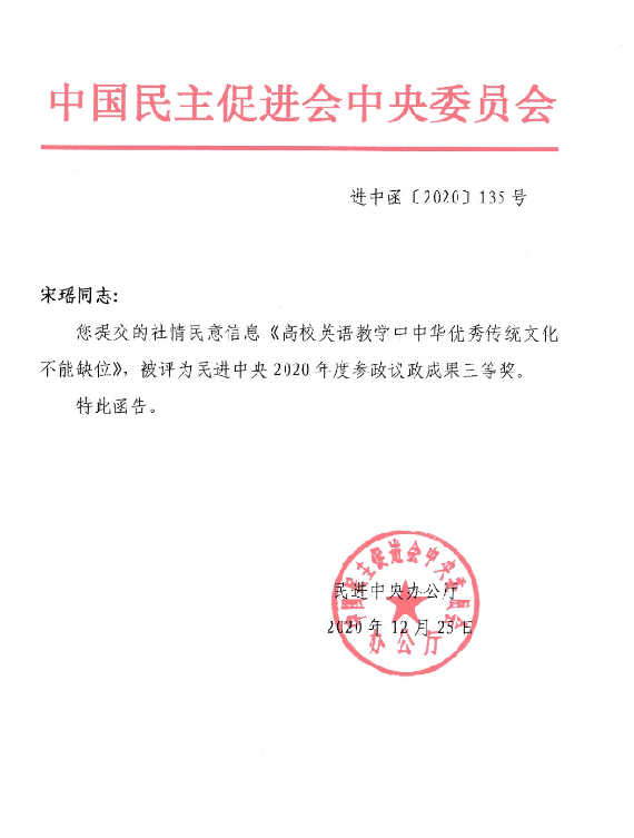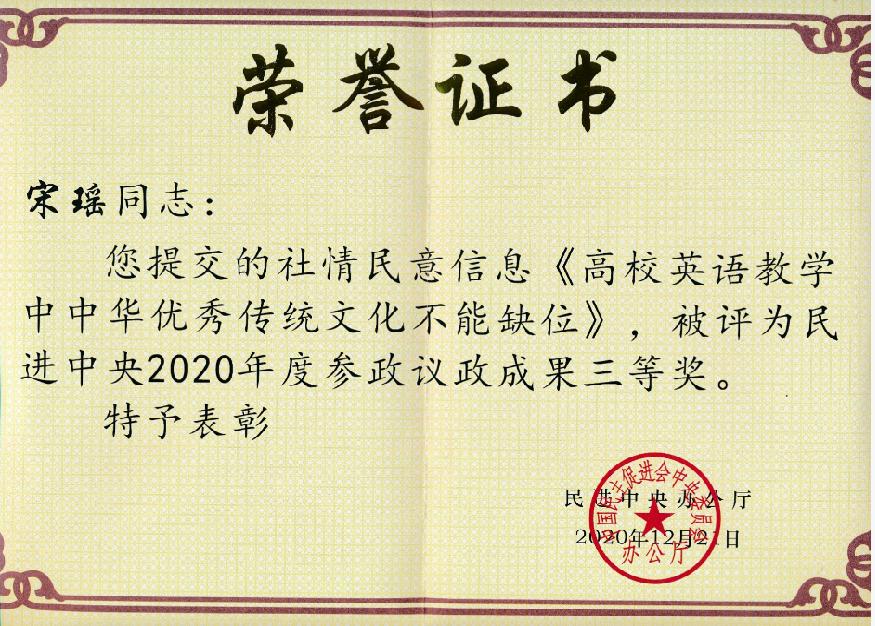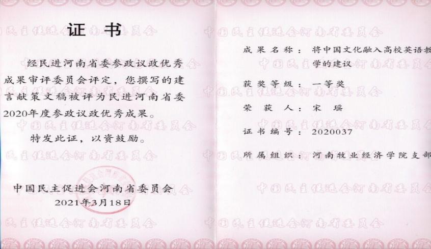 我校太阳成集团122ccvip教师宋瑶老师提交的社情民意信息《高校英语教学中中华优秀传统文化不能缺位》,喜获民进中央2020年度参政议政成果三等奖,宋瑶老师在此基础上撰写的建言献策文稿《将中国文化融入高校英语教学的建议》被评为民进河南省委2020年度参政议政优秀成果一等奖。