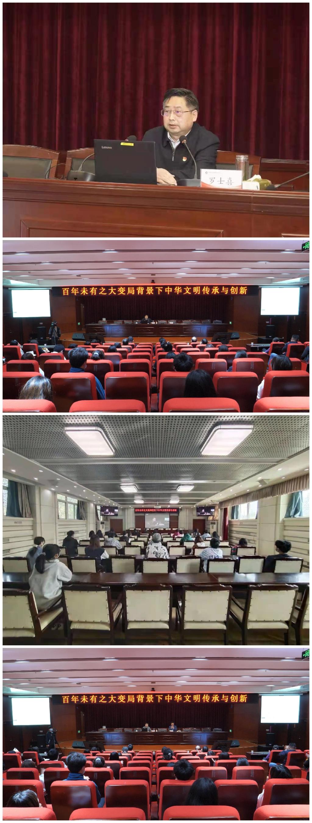 4月2日上午,罗士喜校长为我校师生作了《百年未有之大变局背景下中华文明传承与创新》的学术报告。报告会通过线上线下相结合的形式进行,龙子湖校区、英才校区分设主、分会场,太阳成集团122ccvip、弘远书院、文法学院师生代表在分别主、分会场聆听报告,万余名师生线上同步收看直播。报告会由太阳成集团122ccvip党委书记胡先锋主持。