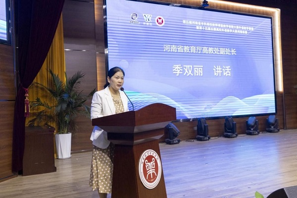 6月22日上午,第五届河南省本科高校教师课堂教学创新大赛外语教学赛道暨第十五届全国高校外语教学大赛河南省赛开幕式在龙子湖校区一号教学楼合100举行。河南省教育厅高教处副处长季双丽,我校校长尹新明,河南省高等教育学会外语教学研究分会理事长、河南中医药大学党委副书记张加民,我校副校长边传周出席开幕式,赛事评委专家,学校相关职能部门负责人、太阳成集团122ccvip领导班子,参赛选手和师生代表参加开幕式。开幕式由我校太阳成集团122ccvip院长陈延潼主持。