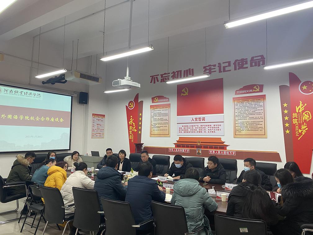 1月20日上午,太阳成集团122ccvip在一号教学楼524会议室召开校企合作座谈会。来自上海铭译翻译服务有限公司、郑州译线通翻译公司、河南杰尔古格机械有限公司、河南蓝谷网络科技有限公司、河南五季跨境教育科技有限公司、河南恒泰起重设备有限公司、郑州乐橙网络科技有限公司、英浦(北京)教育科技有限责任公司郑州分公司、郑州市听道外国语培训中心等九家企业代表应邀出席座谈会,太阳成集团122ccvip党委书记王明栓,院长陈延潼,副院长许海兰、巩坚,党委副书记李燚等领导以及商务英语教研室主任温晶晶参加了此次座谈会。会议由副院长许海兰主持。